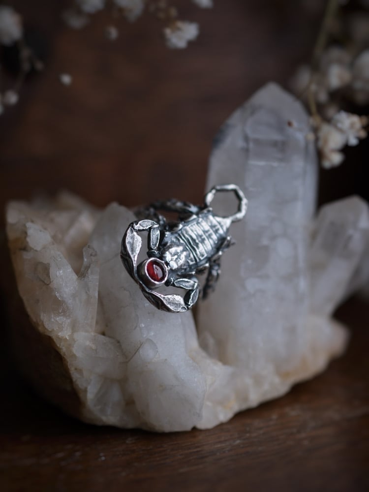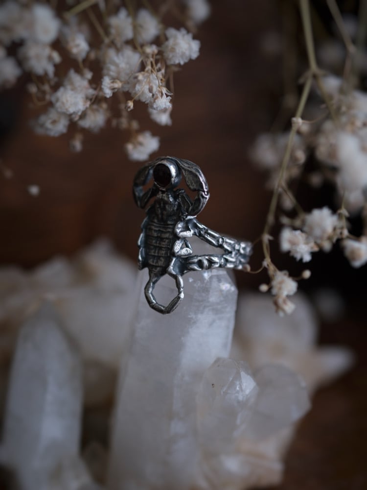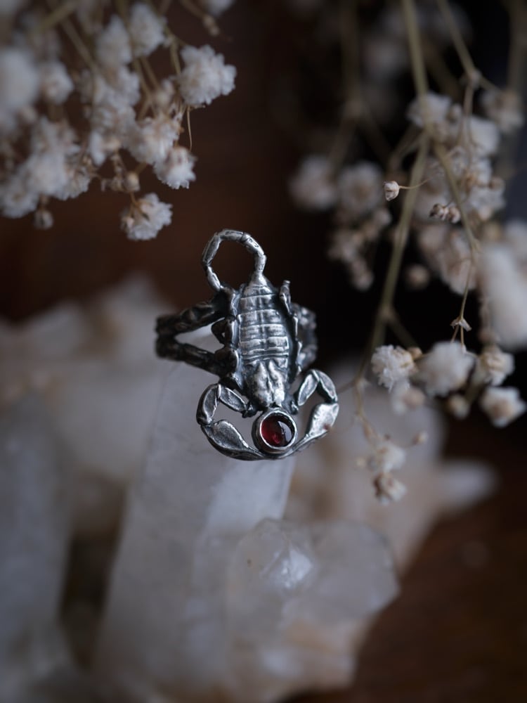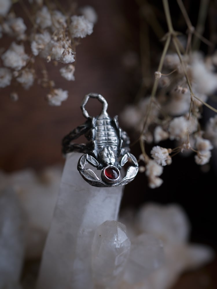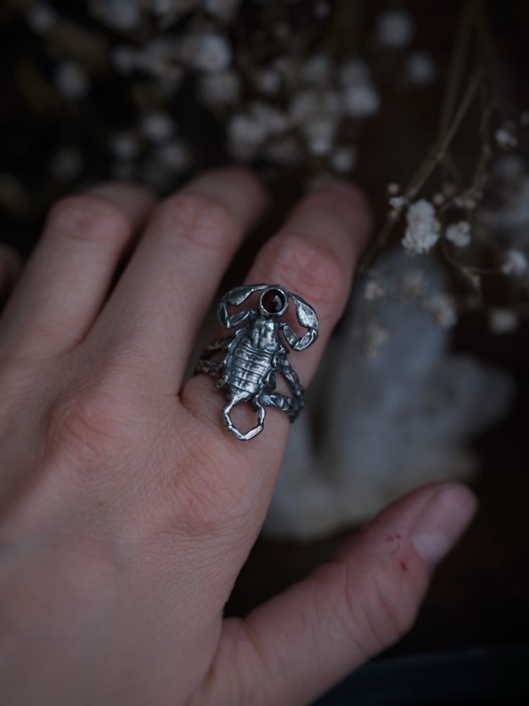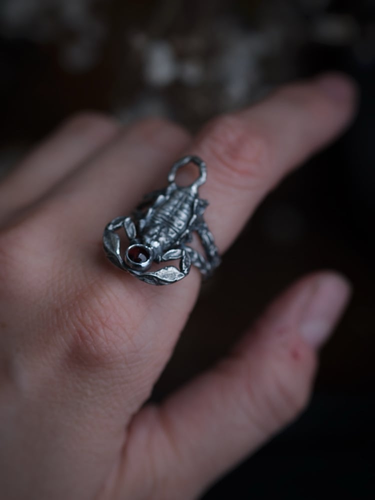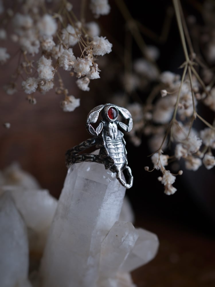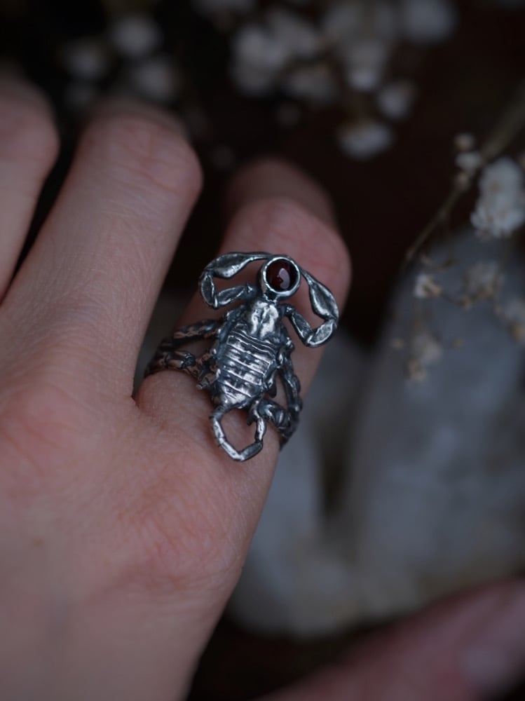 A split ring band made from a few life size scorpion tails, hold a life size scorpion cast with a garnet gemstone!