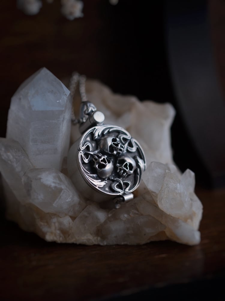 Triple skull ornate keepsake / pill box locket necklace. Handmade in solid .925 sterling silver + jasseron chain, length of choice. This keepsake / pill box locket can hold pills or other small treasures inside, safely locked away. I can also add a personalized laser engraving on the backside (see last photo for an example), this needs to be discussed beforehand, a small added fee will apply.